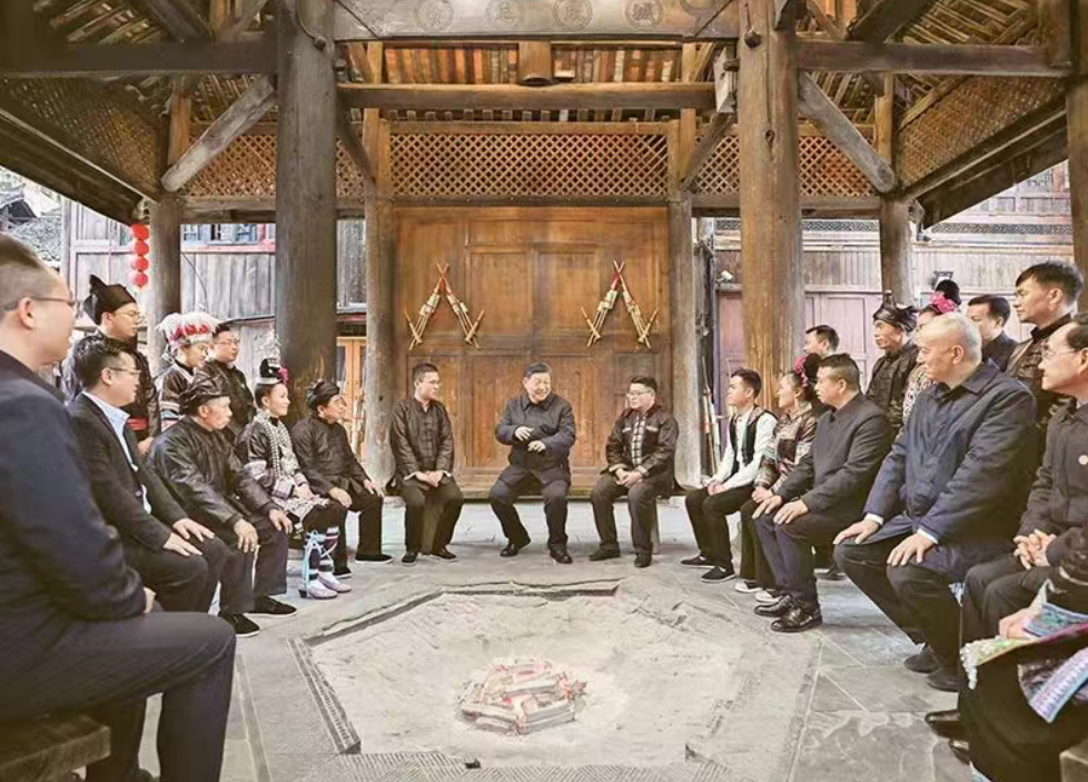 2025年3月17日至18日,中共中央总书记、国家主席、中央军委主席习近平在贵州考察。这是17日下午,习近平在黔东南州黎平县肇兴侗寨考察时,在信团鼓楼同村干部和村民代表围坐在火塘边,共话乡村全面振兴。 新华社记者 谢环驰/摄