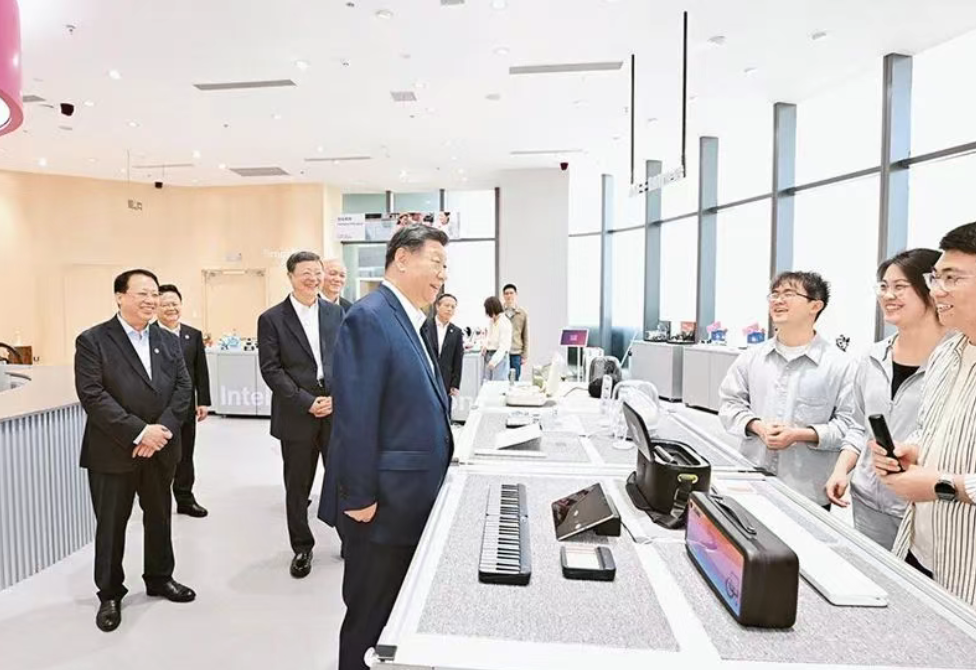 2025年4月29日,中共中央总书记、国家主席、中央军委主席习近平在上海考察。这是习近平在位于徐汇区的上海“模速空间”大模型创新生态社区人工智能产品体验店考察。 新华社记者 谢环驰/摄