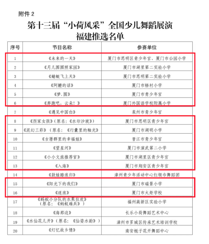 近日,由福建省文联主办,福建省舞协、厦门市思明区教育局承办的“舞悦童心 艺达未来——第十一届福建省原创少儿舞蹈大赛”获奖名单公示,由厦门市舞蹈家协会推荐的14个节目中,13个节目入围复赛,荣获32个奖项,其中4个创作奖金奖、表演奖金奖,4个创作奖银奖、表演奖银奖,5个创作奖铜奖、表演奖铜奖,5个优秀编导奖,12个优秀指导教师奖,2个优秀组织奖。13个节目均入选第十三届“小荷风采”全国少儿舞蹈展演福建推选名单。