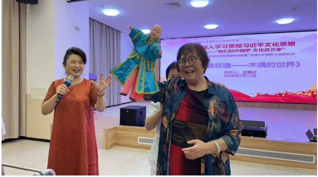 庄晏红为长者们讲述木偶戏的起源、发展脉络、流派特色以及其在闽南文化中的重要地位等,带领长者们走进木偶的世界,感受非遗的独特魅力。表演环节,庄晏红及其学生为长者们表演了栩栩如生的木偶角色。本次活动特别设置 “幕后技艺幕前展” 创新互动环节,老师们手持木偶走进长者中间,手把手指导大家体验木偶戏,学习操控技巧。