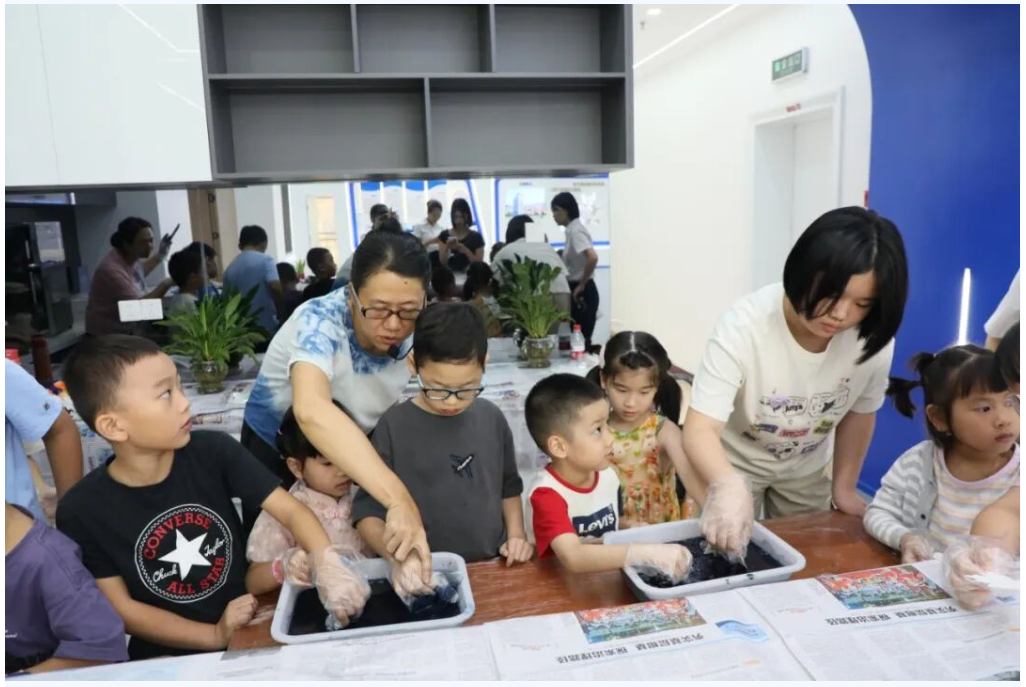 蔡黎翡结合自身研究与创作经历,带领小朋友们了解福建本土非遗传统技艺扎染文化,感受扎染艺术魅力,小朋友们积极与蔡老师互动,参与扎染技艺的学习和制作,选择蝴蝶、方形书签和扇形书签等进行扎染体验,探索了扎染艺术的奥秘。