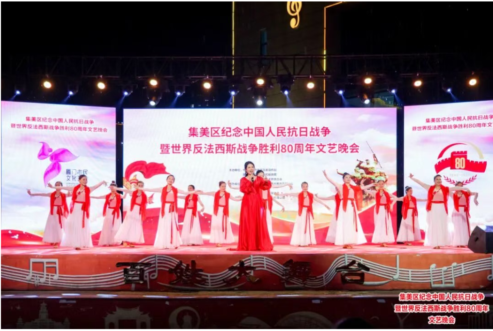 9月2日,由集美区委宣传部、区文旅局、区文联主办,区文化体育事业服务发展中心、区文化馆、区音乐舞蹈家协会承办的集美区纪念中国人民抗日战争暨世界反法西斯战争胜利80周年文艺晚会在杏林文体中心广场举行。本场晚会以“铭记历史、缅怀先烈、珍爱和平、开创未来”为主题,通过艺术盛宴重温烽火岁月,传承红色基因。