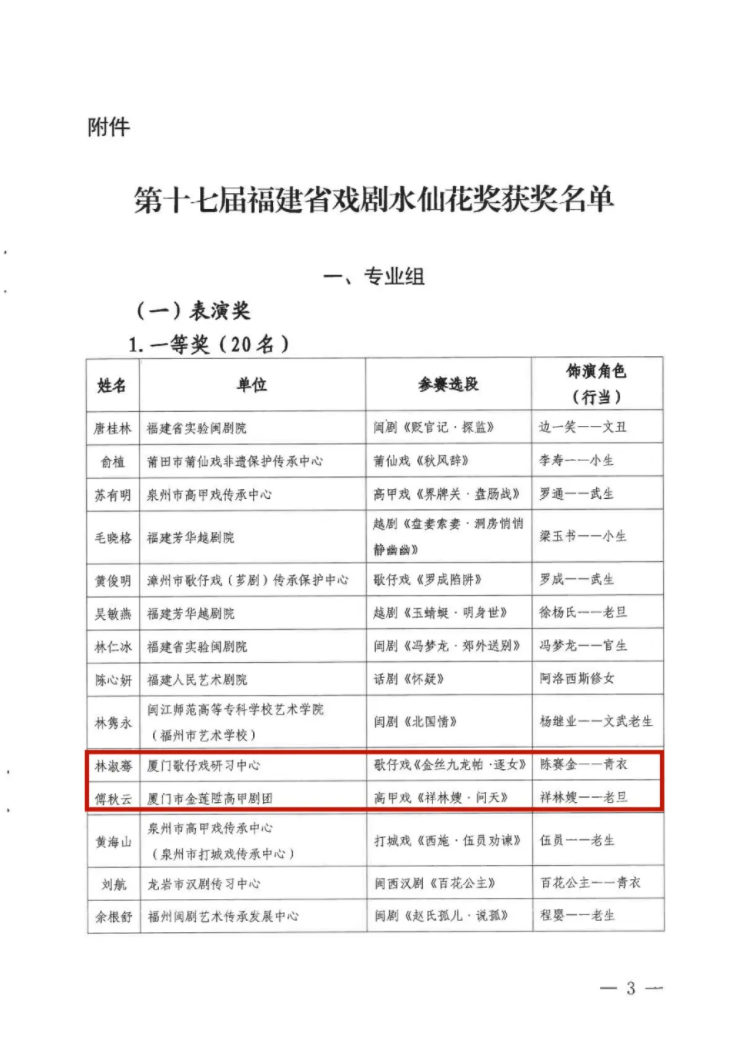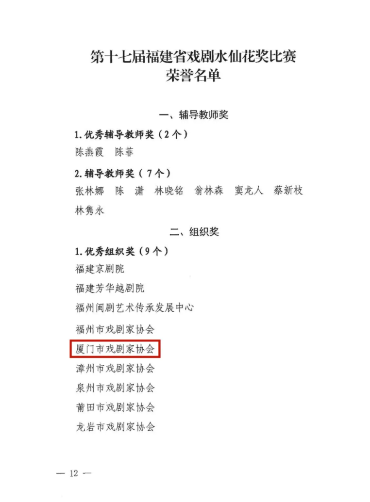 近日,由福建省文学艺术界联合会、福建省文化和旅游厅共同主办,福建省戏剧家协会承办的第十七届福建省戏剧水仙花奖正式揭晓。