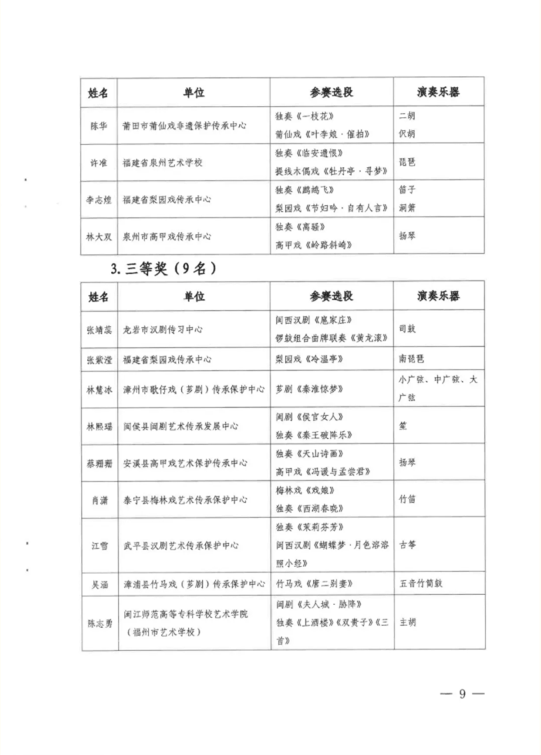 经严格评审、公示等程序,共评选出专业组表演奖105个、演奏奖21个,院校组表演奖5个,民营组表演奖5个。授予优秀辅导教师奖2个、辅导教师奖7个,优秀组织奖9个、组织奖20个。