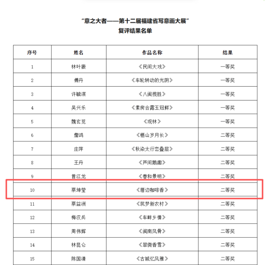 近日,“意之大者——第十二届福建省写意画大展”复评结果公示,经福建省美协组织专家对作品进行评审,评出入展作品100件,其中一等奖5件,二等奖10件,三等奖20件,入选作品65件。