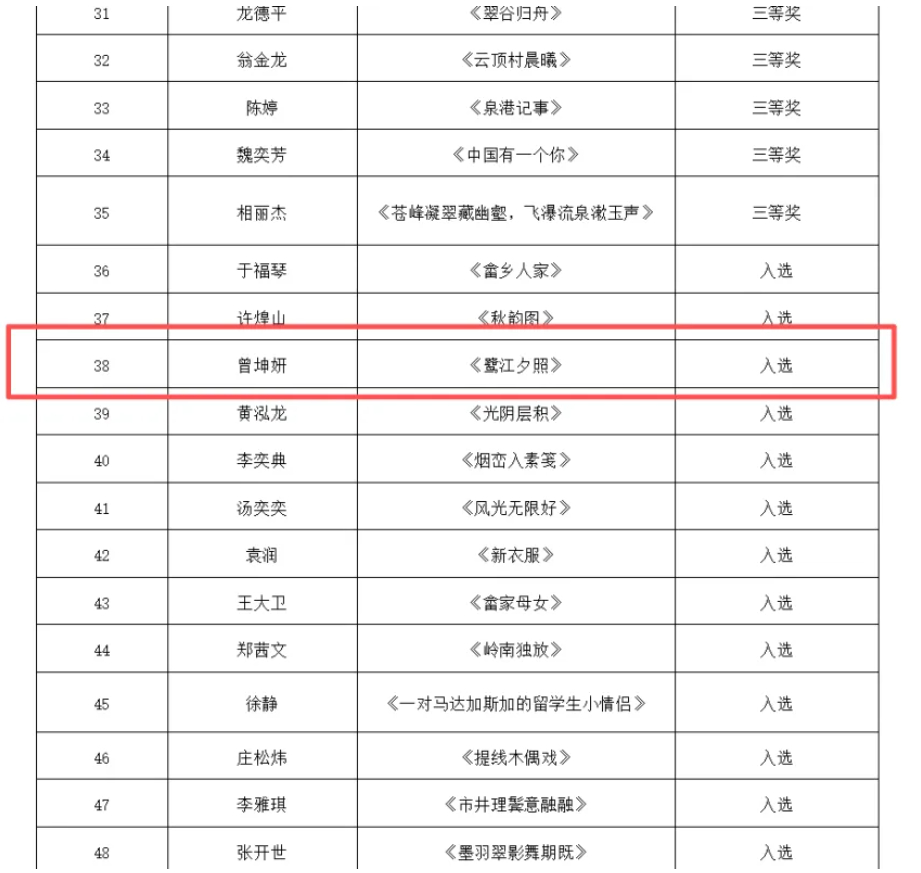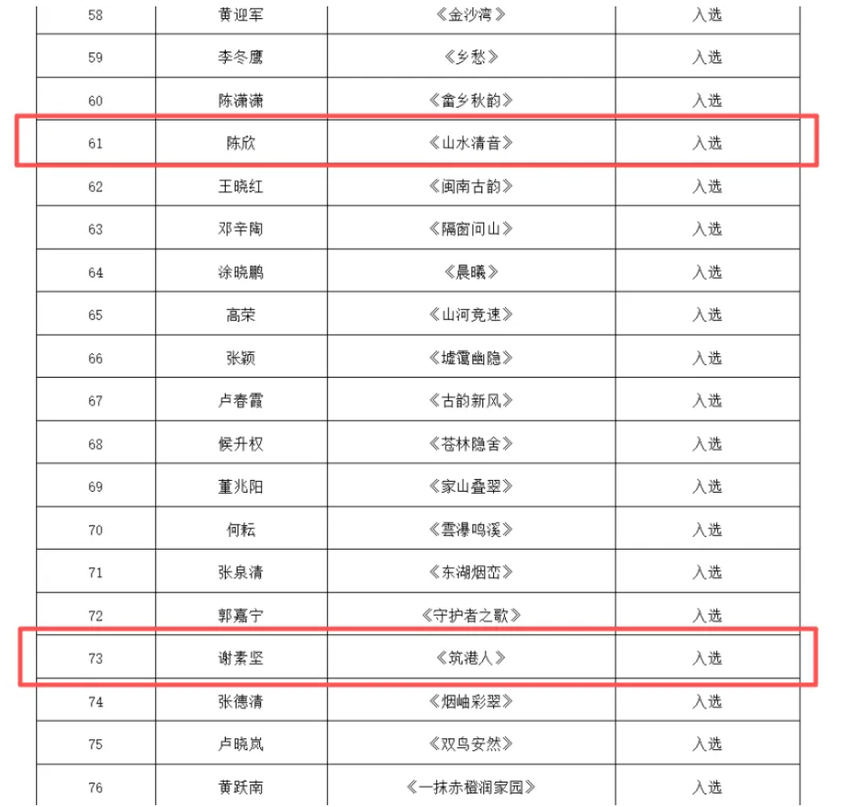 我市美协6位会员作品入展,其中,蔡坤莹作品《厝边咖啡香》获二等奖,曾坤妍作品《鹭江夕照》、陈欣作品《山水清音》、谢素坚作品《筑港人》、魏巧云作品《烟渚鹭影立红蕖》、倪玉琼作品《我在舞台上》入选。