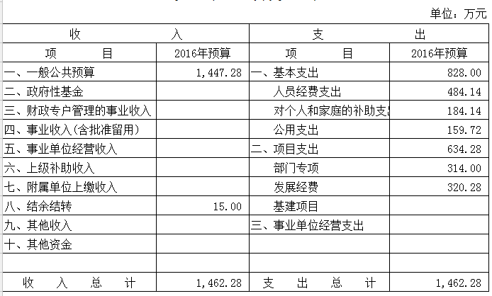 根据预算管理的有关规定,部门的全部收入和支出都反映在预算中。2016年, 部门收入预算为1462.28万元,其中:一般公共预算1447.28万元,结余结转资金15.00万元。相应安排支出预算1462.28万元,其中:人员支出484.14万元,对个人和家庭的补助支出184.14万元,公用支出159.72万元,项目支出634.28万元。