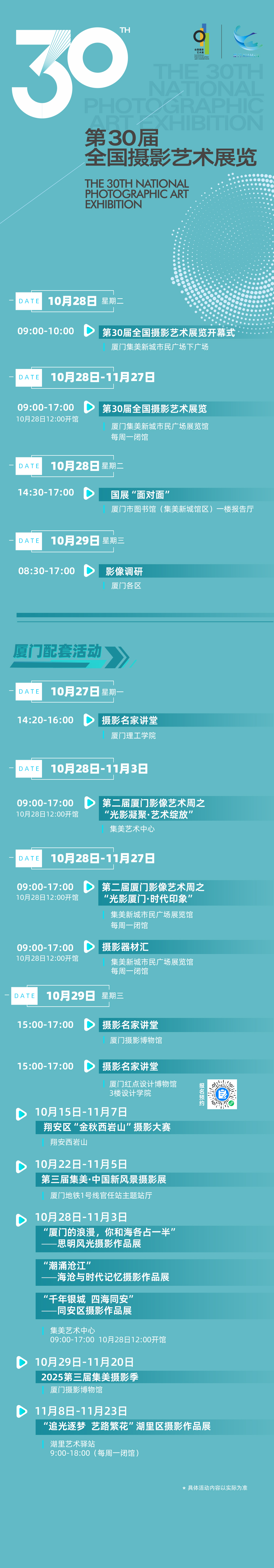 开幕式、第30届全国摄影艺术展览、国展“面对面”、影像调研。展览期间,厦门市还将举办第二届厦门影像艺术周、系列摄影名家讲堂、摄影器材汇,以及各区摄影主题活动,旨在搭建全国摄影宣传展示、资源汇聚、创作交流等综合平台。