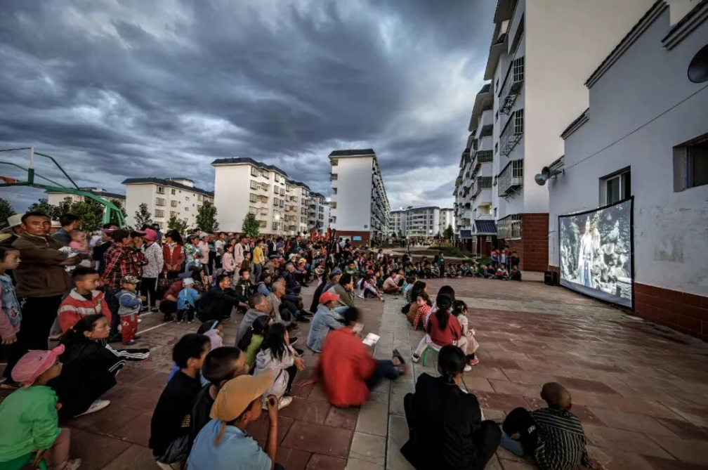 2020年6月17日,易地搬迁到梅雨龙家湾社区的村民看坝坝电影。