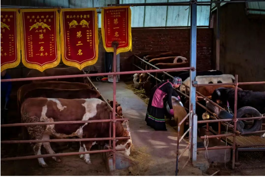 2025年2月4日7时许,村民王巫甲在自己的农场里喂牛。