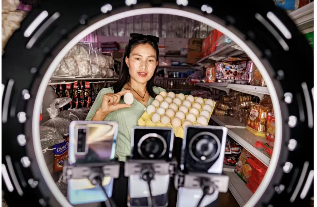 2024年5月1日,村民杨丽在自己的超市里尝试网络直播销售土鸡蛋等农产品。