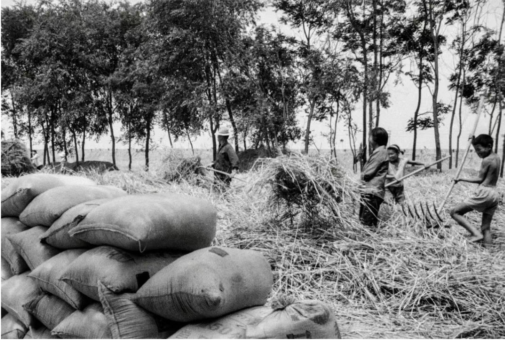 1976年6月13日,佃户屯公社社员在暴风雨到来之前抢收小麦,确保颗粒归仓。