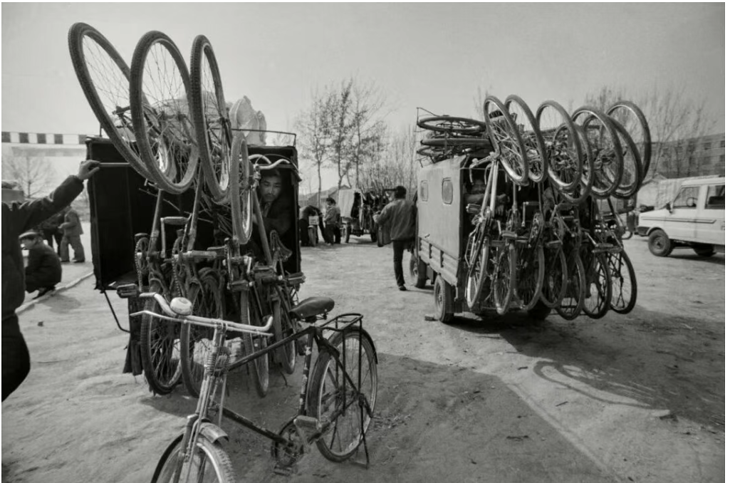 1988年5月12日,王浩屯乡,自行车“坐”上三轮车,“摆渡”着城乡出行的乘客。