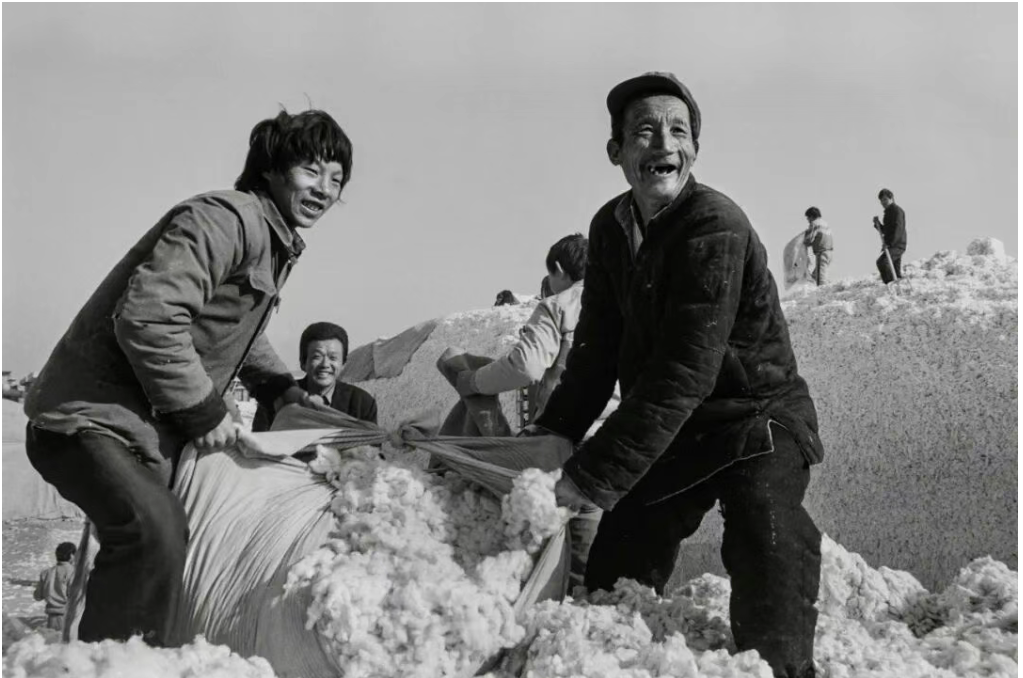 1990年10月25日,菏泽一棉厂,村民宦玉平和孙子交售新棉。宦玉平依托党的好政策粮棉丰收、家有余粮。