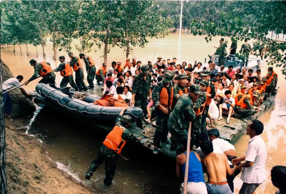 1996年8月11日,鄄城县,党政军民联合济南舟桥部队抢险救灾。此前,黄河1号洪峰以6200立方米/秒流量侵袭菏泽,20万群众被困。