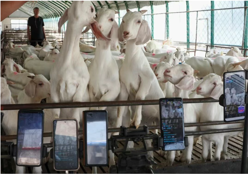 2024年5月3日,嘉祥县黄垓镇,养殖专业户司瑞敏正在直播,几只山羊突然冲向直播镜头前。