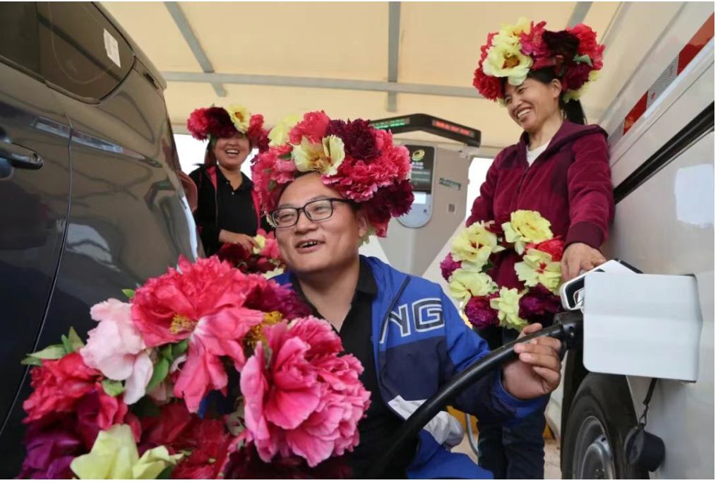 2025年4月21日,鄄城县董口镇西张庄村,村民张汉超给超市送货,午饭间歇给电动汽车充电,还给家人买了牡丹。