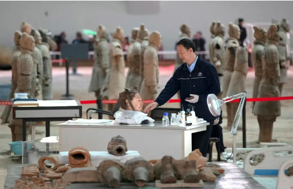 2023年3月31日,西安,秦始皇帝陵博物院一号坑修复现场,修复专家兰德省正在保护去年6月新出土的一件彩绘俑头。兰德省修复秦俑26年,在漫长的职业生涯中,他带领团队修复了130余件兵马俑。