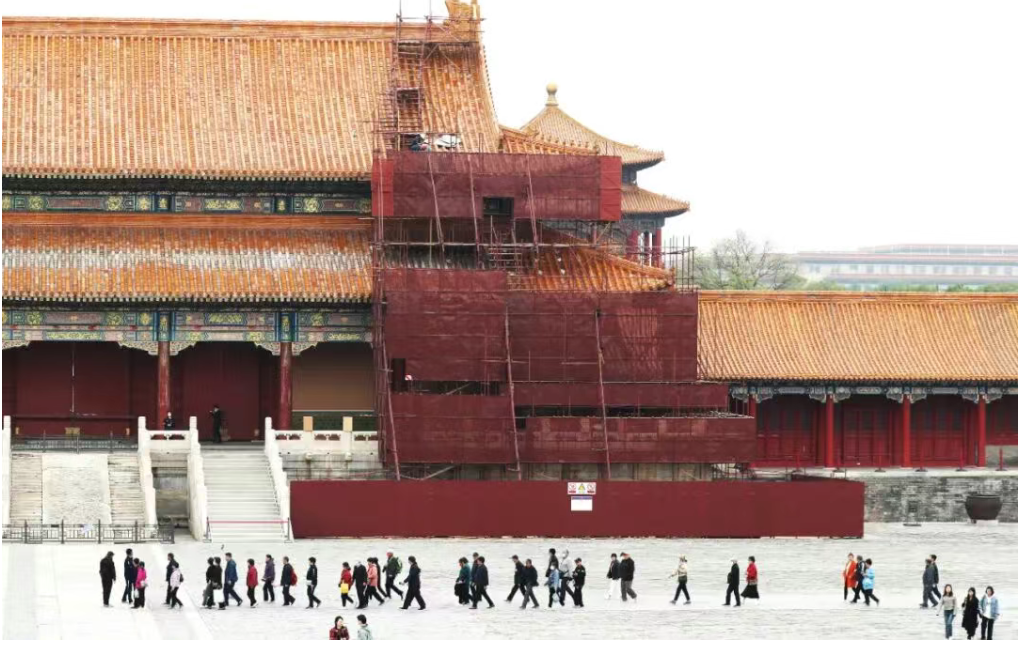 2023年4月23日,北京,游客从正在修缮的故宫博物院太和门前走过。