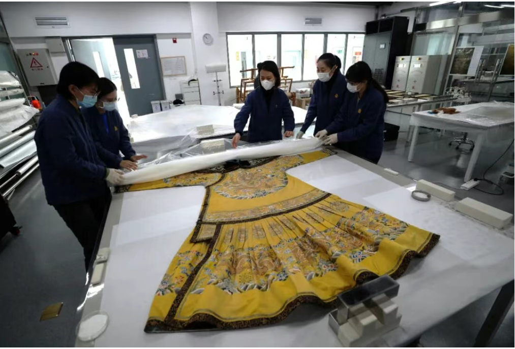 2022年3月7日,北京,故宫博物院文保科技部织绣修复师们展示修复好的龙袍。这5名织绣修复师均为年龄不超过40岁的女性,她们不仅要掌握文物修复知识,还要熟悉各类织绣工艺技法。从2005年至今,她们已修复文物百余件。