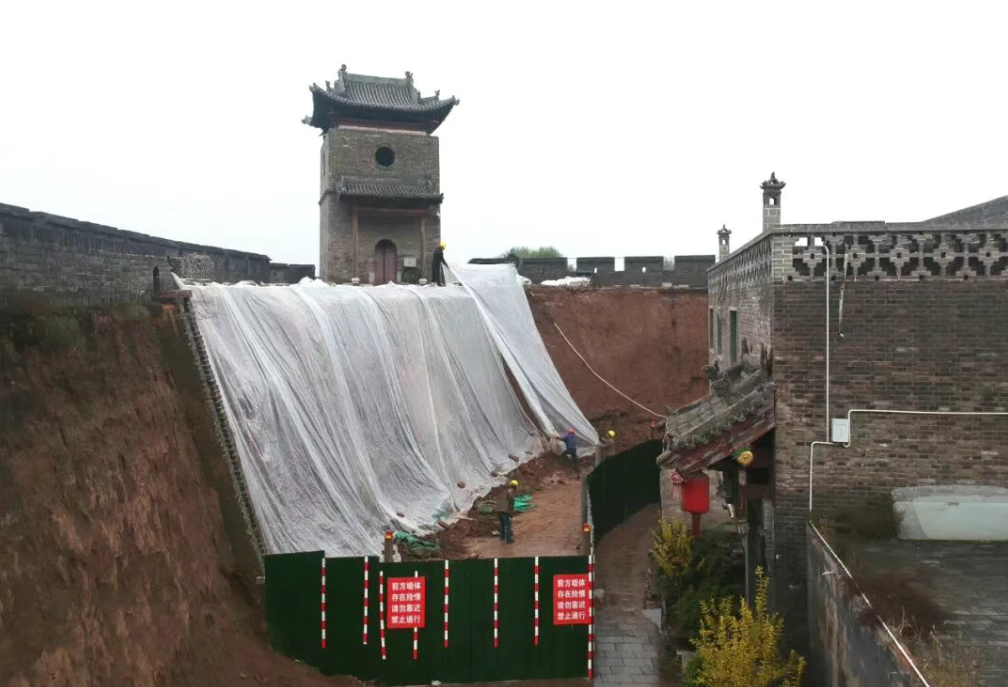2021年10月20日,山西平遥,天降小雨,平遥古城城墙内侧夯土裸露,工作人员用塑料布遮挡起来。