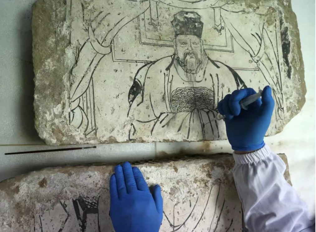 2023年3月23日,太原,山西博物院,壁画修复师对兴县裴家川口村发掘的壁画进行加固处理保护。