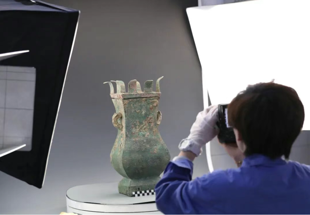 2023年3月23日,太原,山西博物院,金属修复师张春秋对文物进行拍照建档。