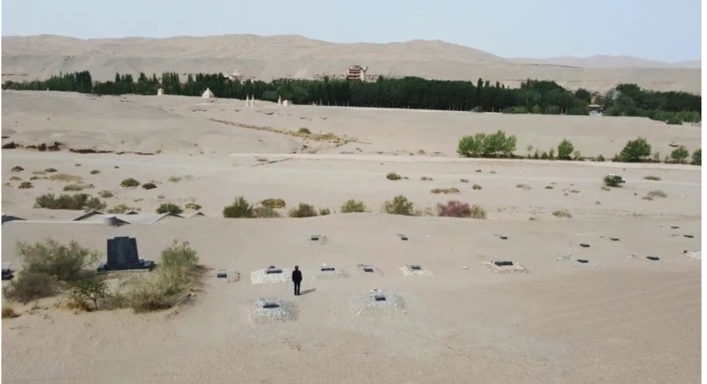 2023年5月16日,甘肃敦煌,敦煌研究院文物保护专家樊再轩来到敦煌研究院公墓区缅怀为敦煌文物事业作出贡献的先辈们。