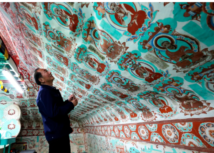 2023年5月16日,甘肃敦煌,樊再轩在莫高窟第196窟文物保护修复工作现场。