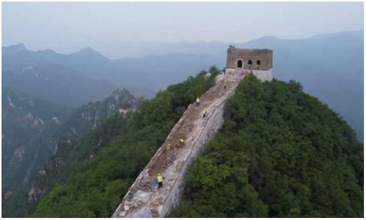 2024年7月9日,北京,箭扣长城正北楼附近,工人正在施工。当年箭扣长城五期保护修缮项目开工。