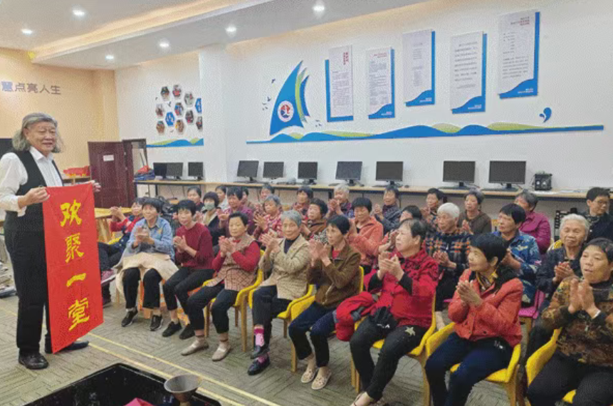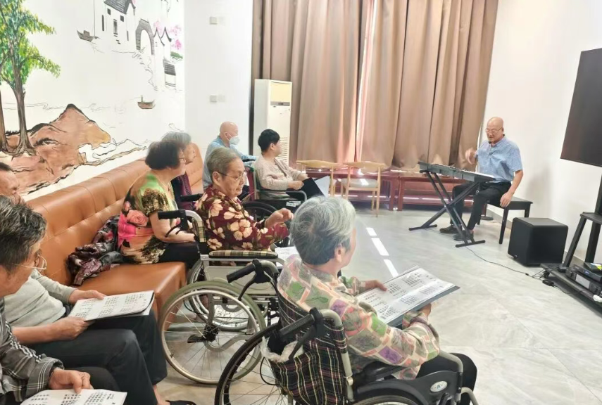 课上,魏良河首先介绍四川民歌《康定情歌》节奏特点和文化意涵,在他的指导下,老人们全情投入到排练中,歌声时而激昂高亢,时而温柔细腻,用心诠释了歌曲中的情感与意境。课程后半段还复习了此前学习的歌曲。音乐课程让长者们学习了科学的发声方法,在音乐世界中感受温暖与欢乐。