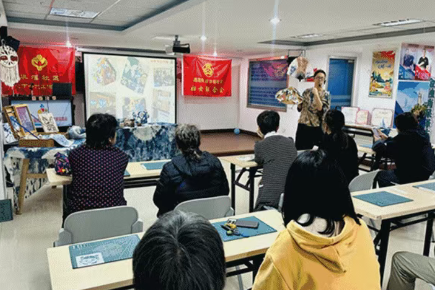 蔡黎翡首先介绍了扎染的历史渊源、文化特色和工艺原理,特别介绍了扎染技艺在福建地区的传承与发展,她现场展示了如何从洋葱皮等日常植物中提取天然染料,展现了古人“取法自然”的生态智慧,引得在场居民们连连称奇。在实践环节,她手把手指导居民制作各具特色的扎染作品。活动现场,银发长者重温传统记忆,年轻居民感受手工艺的匠心,不同代际的参与者在折叠与染制中积极交流,增进了邻里情感,在亲身实践中感受非遗魅力。