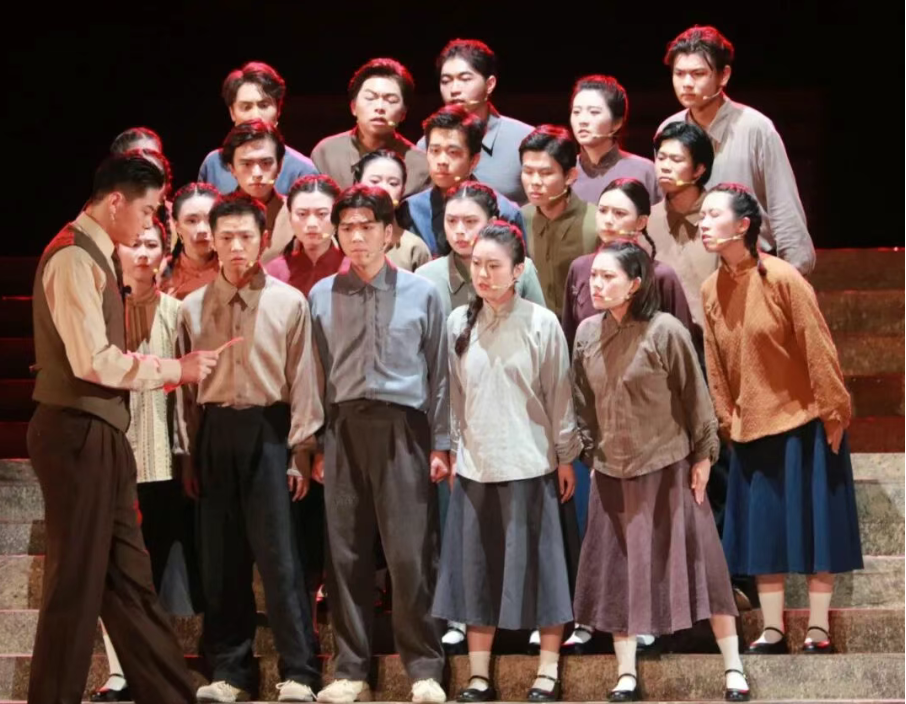 该剧的叙事张力源于大历史与小温情的平衡,在办学历程的主线之外,剧目巧妙织入多元线索:萨本栋与黄淑慎之间质朴的情愫,让“铁血”校长的形象多了几分柔情;学生们走进观众席宣传抗战的热血,将家国情怀转化为可触的行动,厦门大学师生的形象便有了具象落点。那些细碎的日常与真挚的情感,让抽象的校史史料蜕变为有温度、有质感的生命故事,也让“自强不息、止于至善”的校训从文字记载成为可感可知的精神传承。