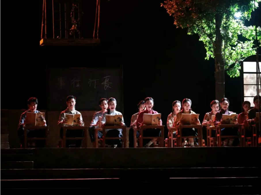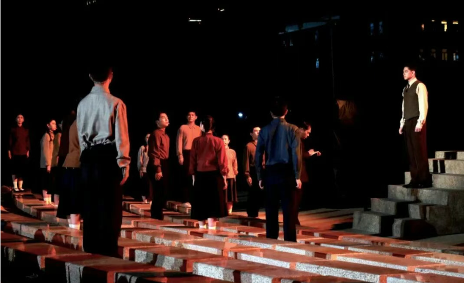 音乐是重要的情感载体,钢琴的沉郁烘托出西迁路上的艰涩,笛子的悠扬点染师生间的温情。当乐声与晚风共舞,历史的距离感便在视听交融中悄然消解。更动人的是打破“第四堵墙”的设计——校长在西迁路上为大家鼓劲,学生举着“抗战救国”的横幅从观众身边走过,脚步声、呼喊声近在耳畔,仿佛80年前的烽火就在眼前,让观众从旁观者变为亲历者,完成一场跨越时空的情感共振。终场,当合唱的旋律响起,全体师生向轮椅献花的场景,默默然,却带着雷霆万钧的力量。这种情感冲击并非刻意煽情,而是历史本身的力量与艺术表达的精准结合。