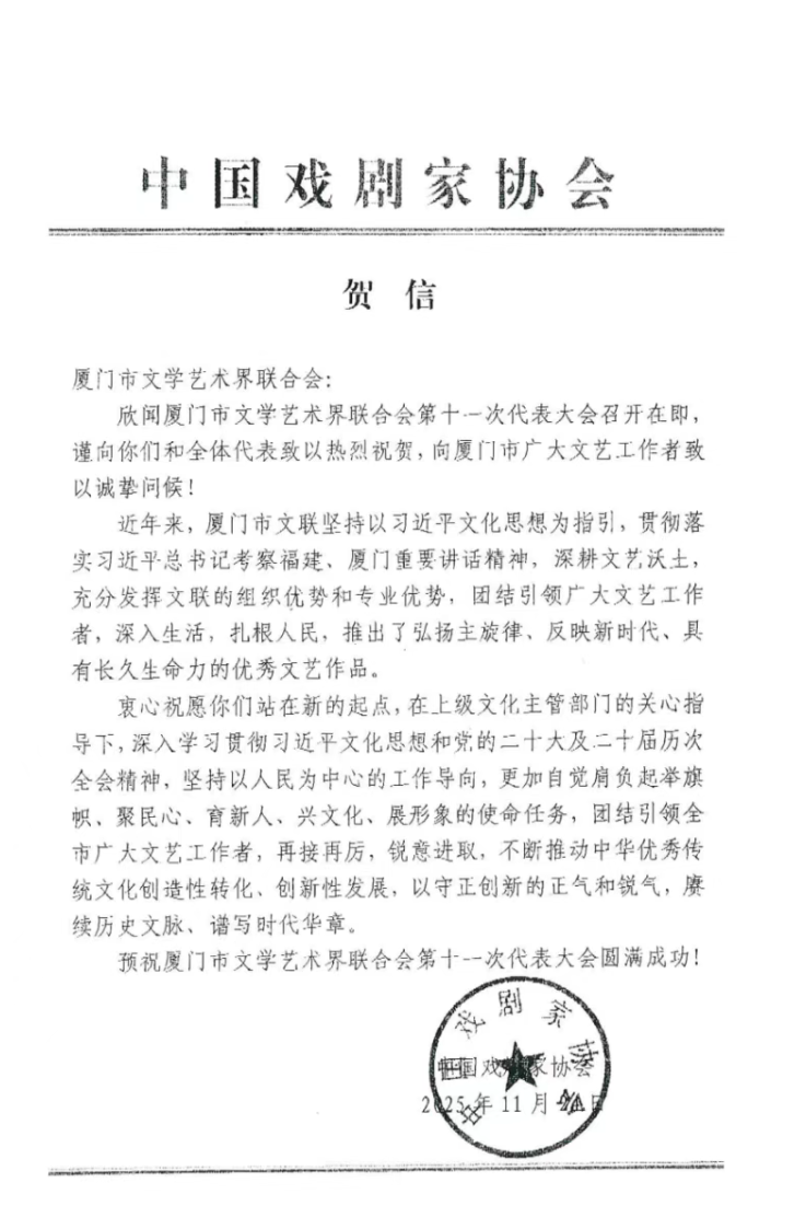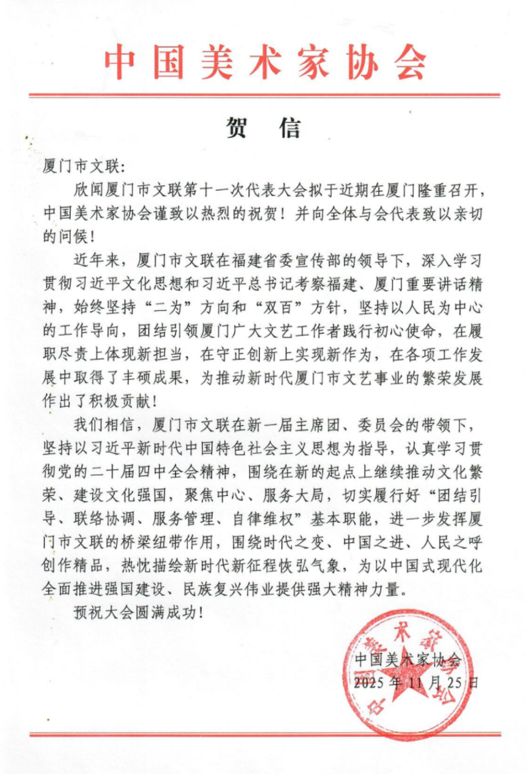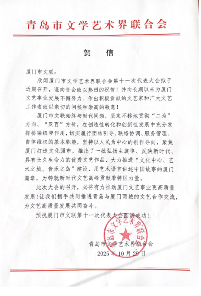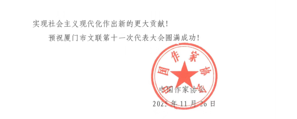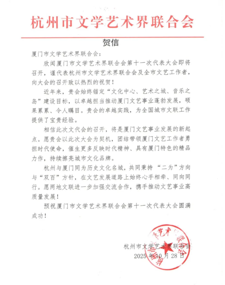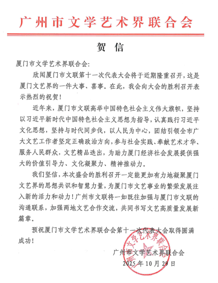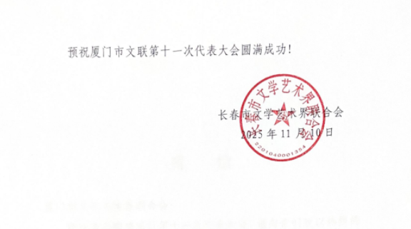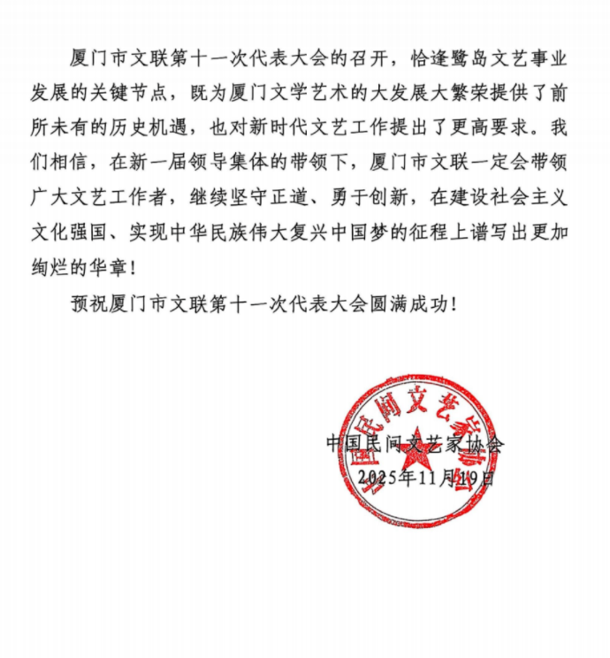 2025年12月6日,厦门市文联第十一次代表大会胜利召开。中国作协、中国文联国内联络部、中国各文艺家协会、各副省级城市文联、香港特别行政区政府驻福建联络处、菲律宾共和国驻厦门总领事馆、泰王国驻厦门总领事馆、新加坡驻厦门总领事馆、新西兰太平洋文化艺术交流中心等32家单位向厦门市文联发来贺信、贺函。