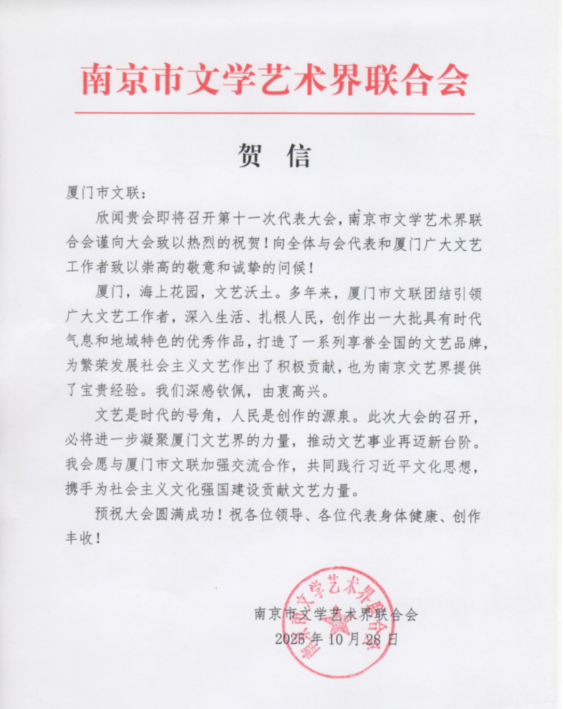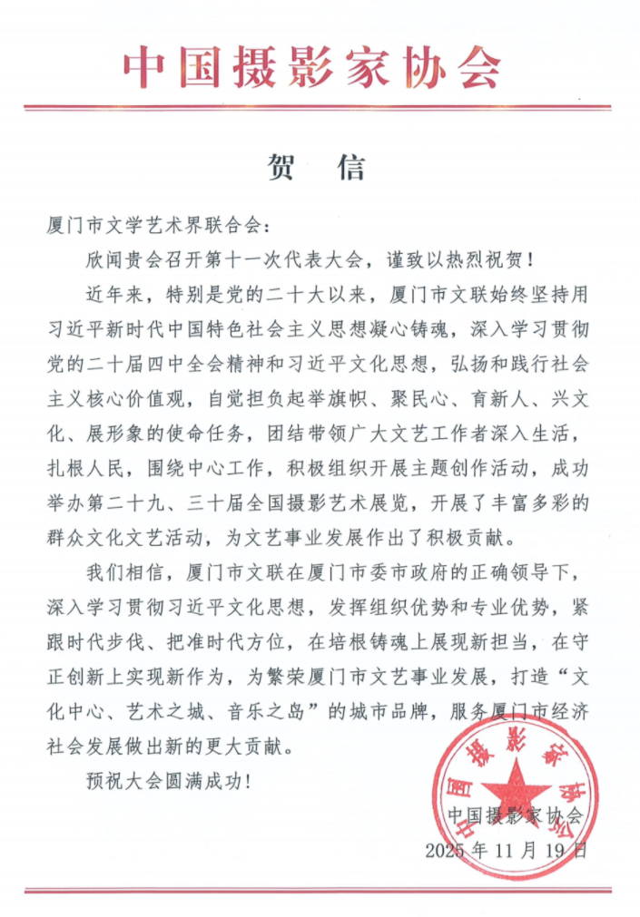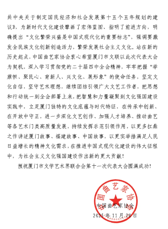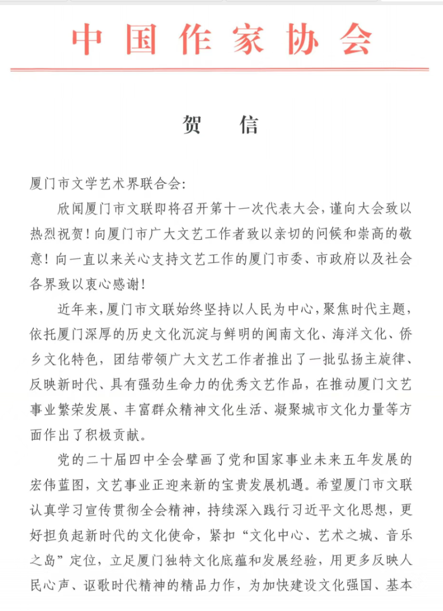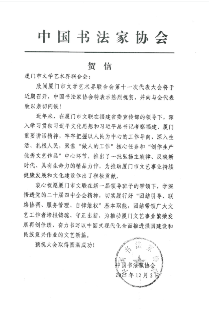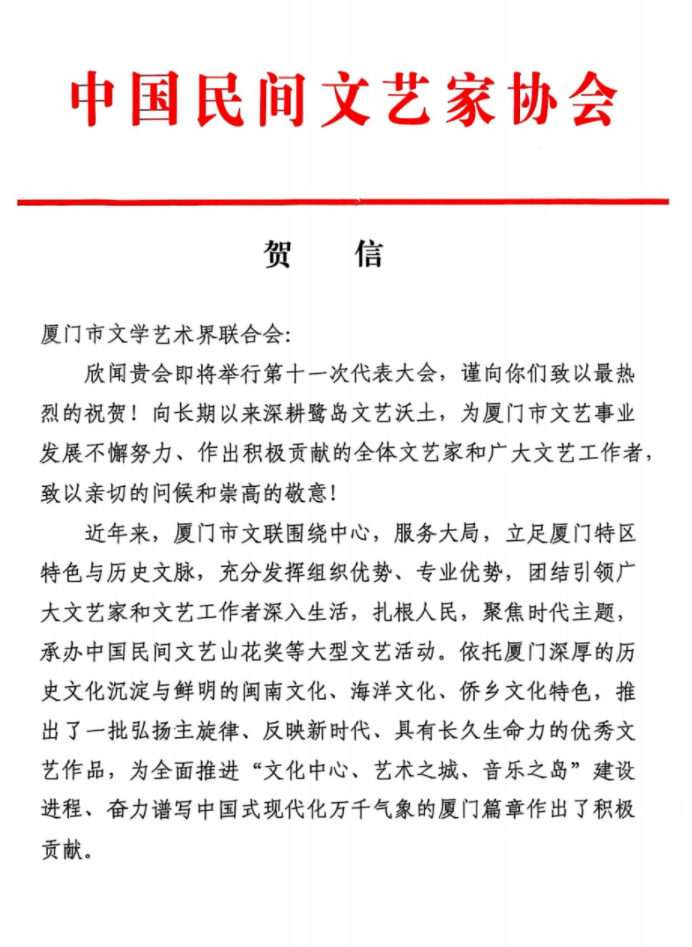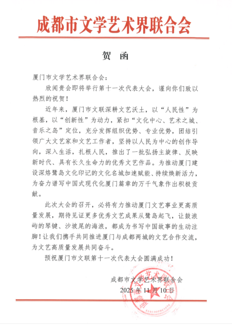 2025年12月6日,厦门市文联第十一次代表大会胜利召开。中国作协、中国文联国内联络部、中国各文艺家协会、各副省级城市文联、香港特别行政区政府驻福建联络处、菲律宾共和国驻厦门总领事馆、泰王国驻厦门总领事馆、新加坡驻厦门总领事馆、新西兰太平洋文化艺术交流中心等32家单位向厦门市文联发来贺信、贺函。