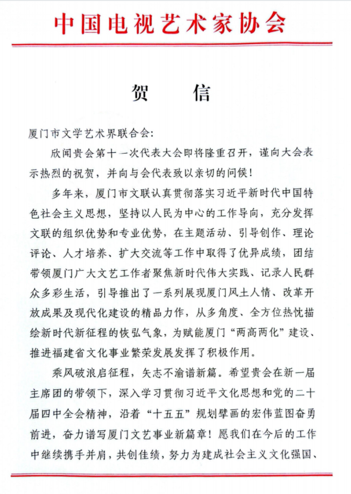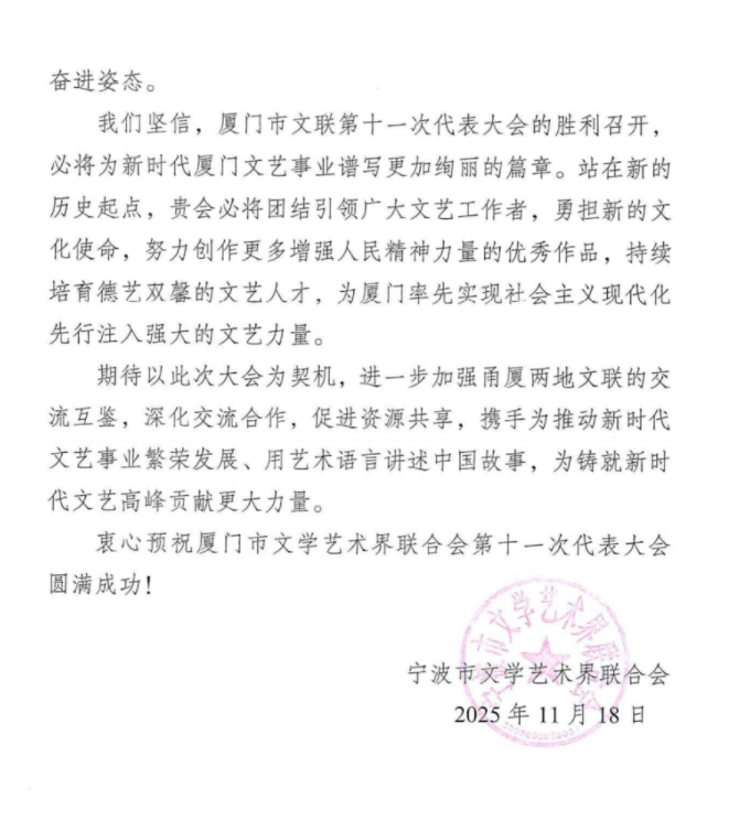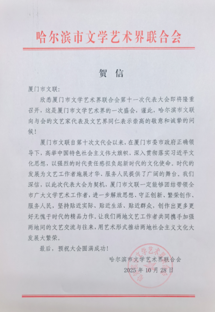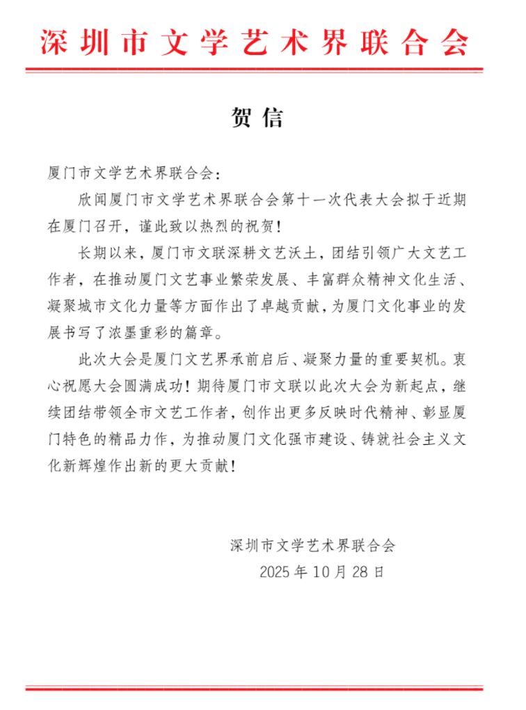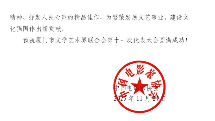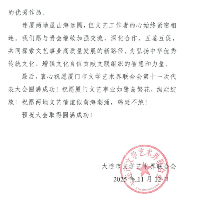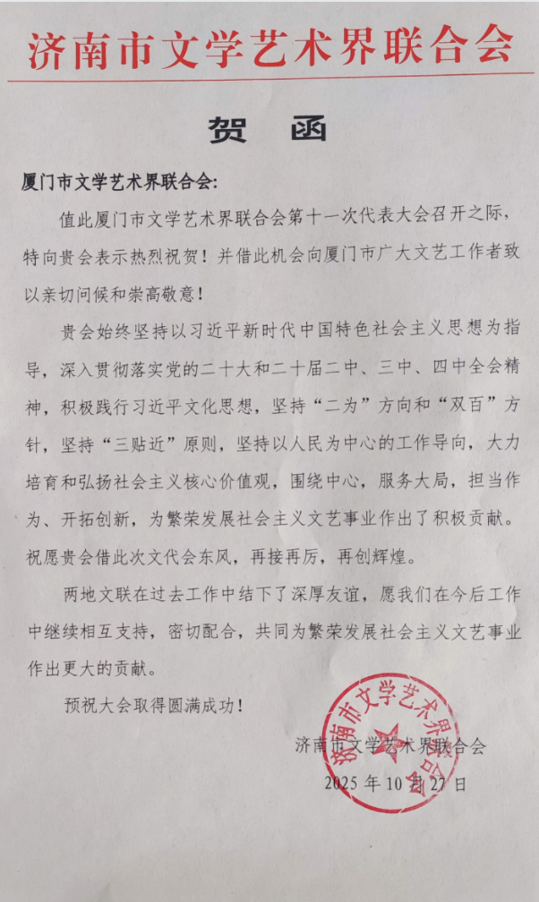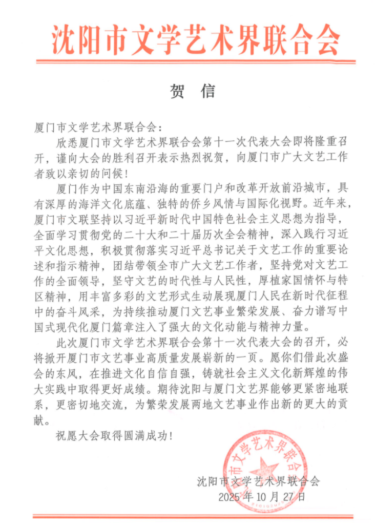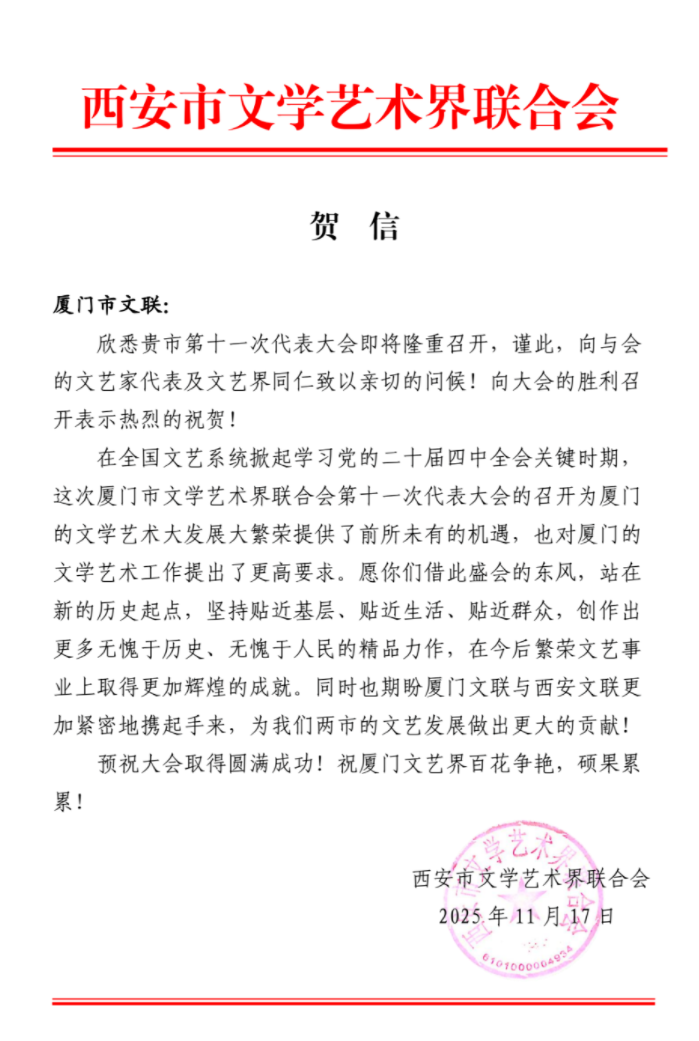 2025年12月6日,厦门市文联第十一次代表大会胜利召开。中国作协、中国文联国内联络部、中国各文艺家协会、各副省级城市文联、香港特别行政区政府驻福建联络处、菲律宾共和国驻厦门总领事馆、泰王国驻厦门总领事馆、新加坡驻厦门总领事馆、新西兰太平洋文化艺术交流中心等32家单位向厦门市文联发来贺信、贺函。