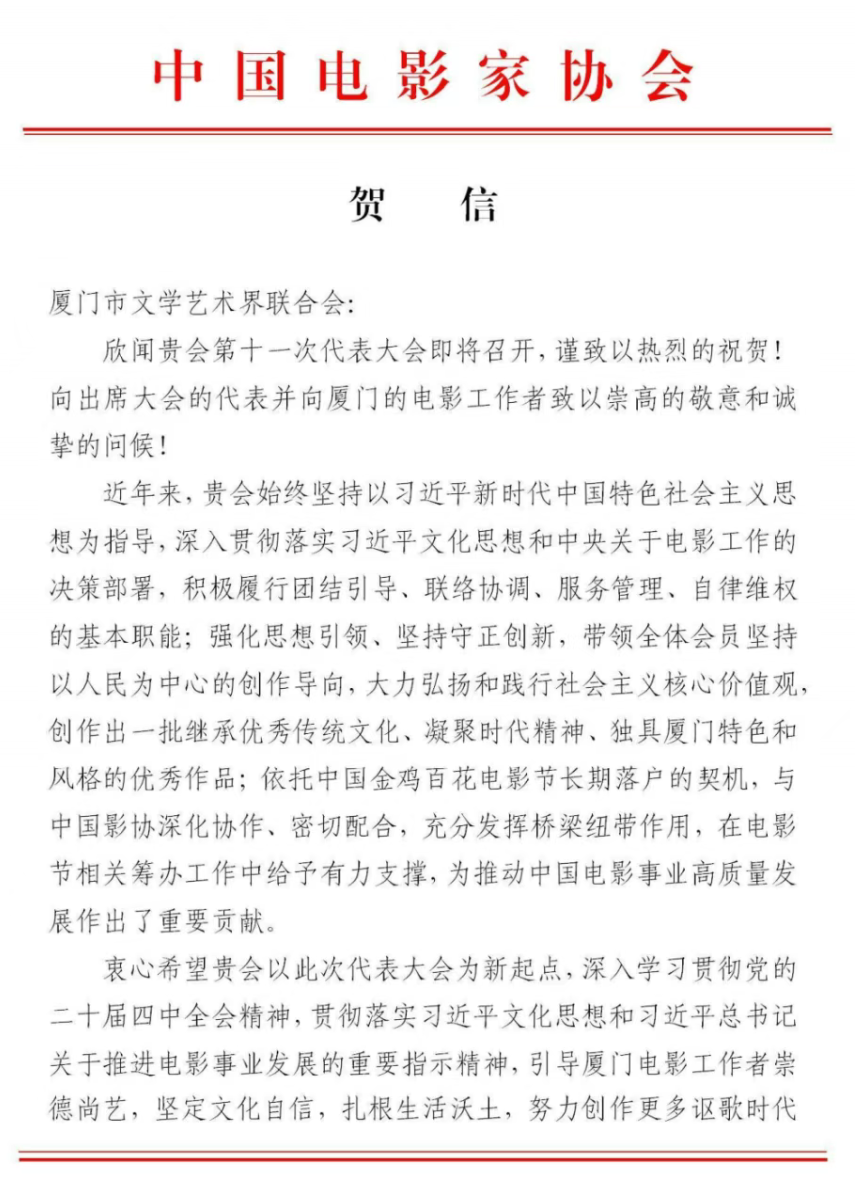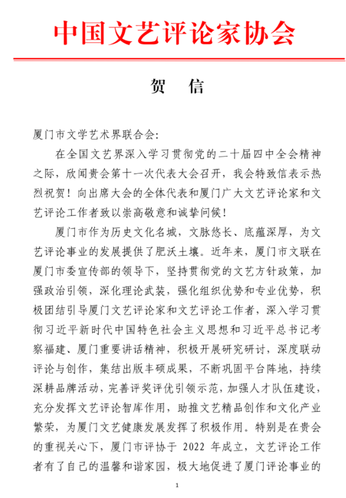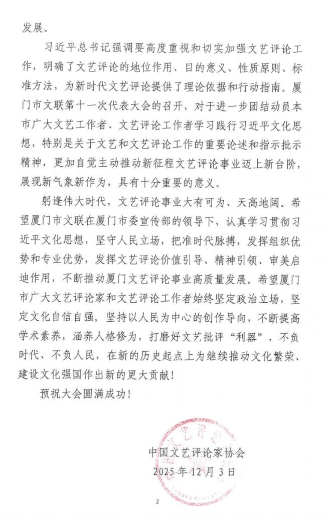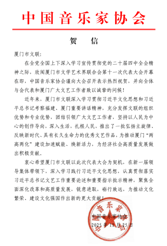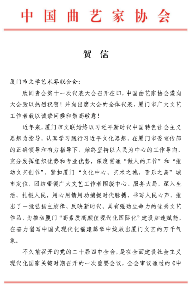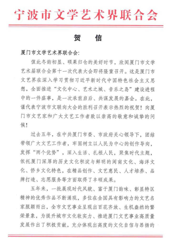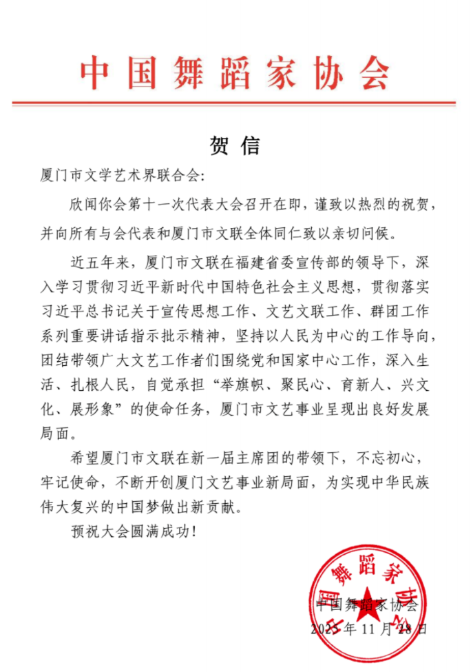 2025年12月6日,厦门市文联第十一次代表大会胜利召开。中国作协、中国文联国内联络部、中国各文艺家协会、各副省级城市文联、香港特别行政区政府驻福建联络处、菲律宾共和国驻厦门总领事馆、泰王国驻厦门总领事馆、新加坡驻厦门总领事馆、新西兰太平洋文化艺术交流中心等32家单位向厦门市文联发来贺信、贺函。