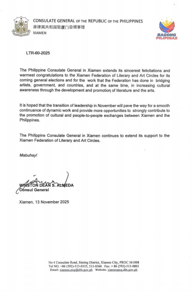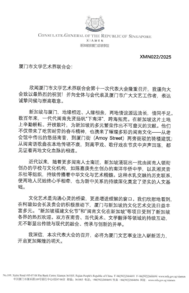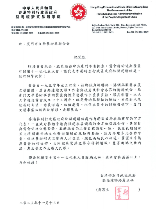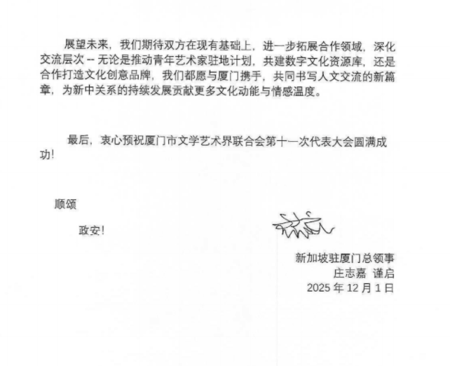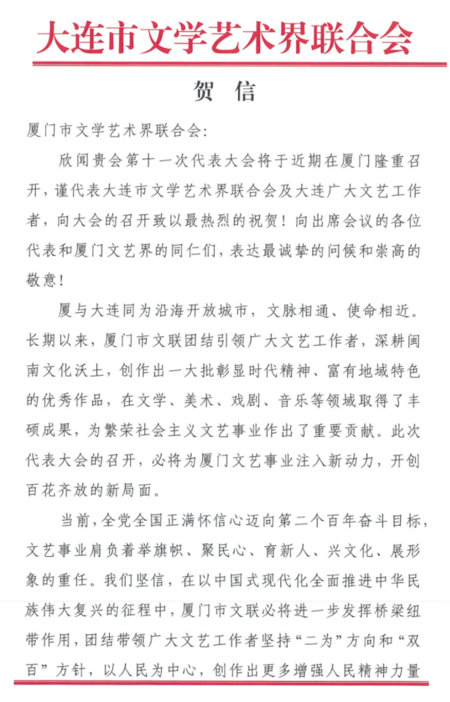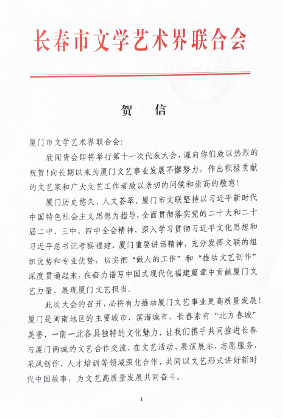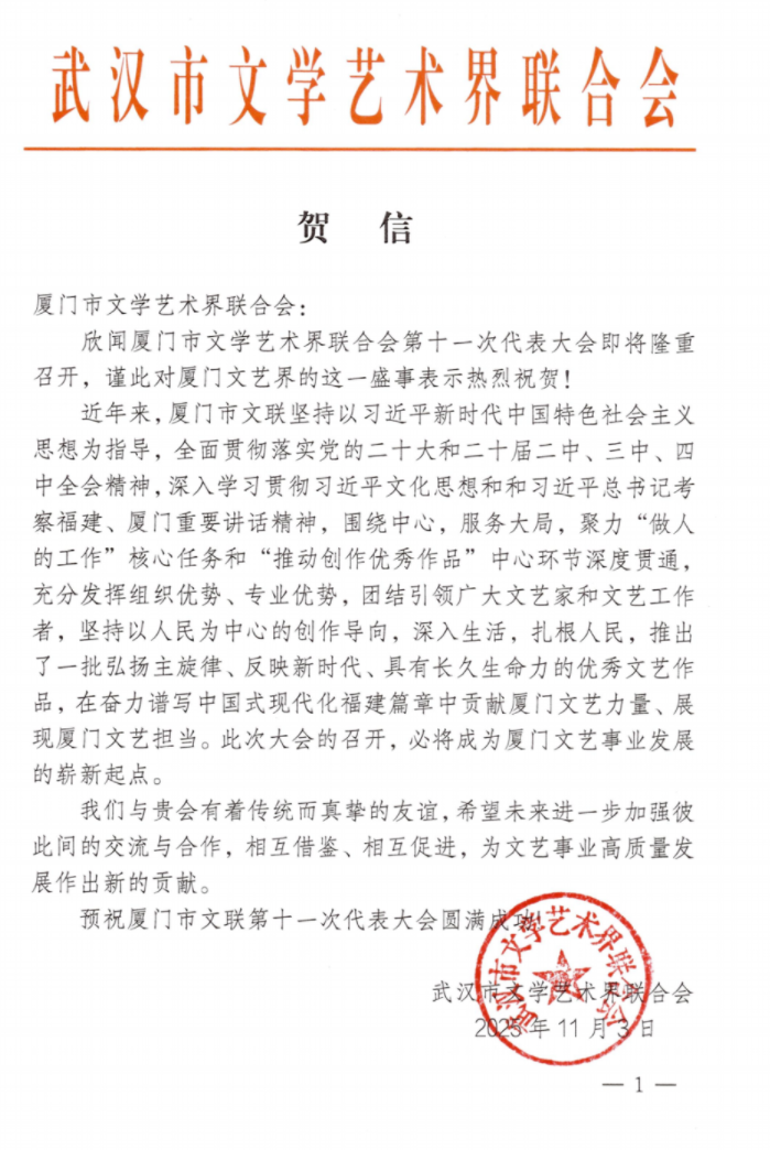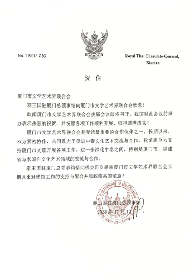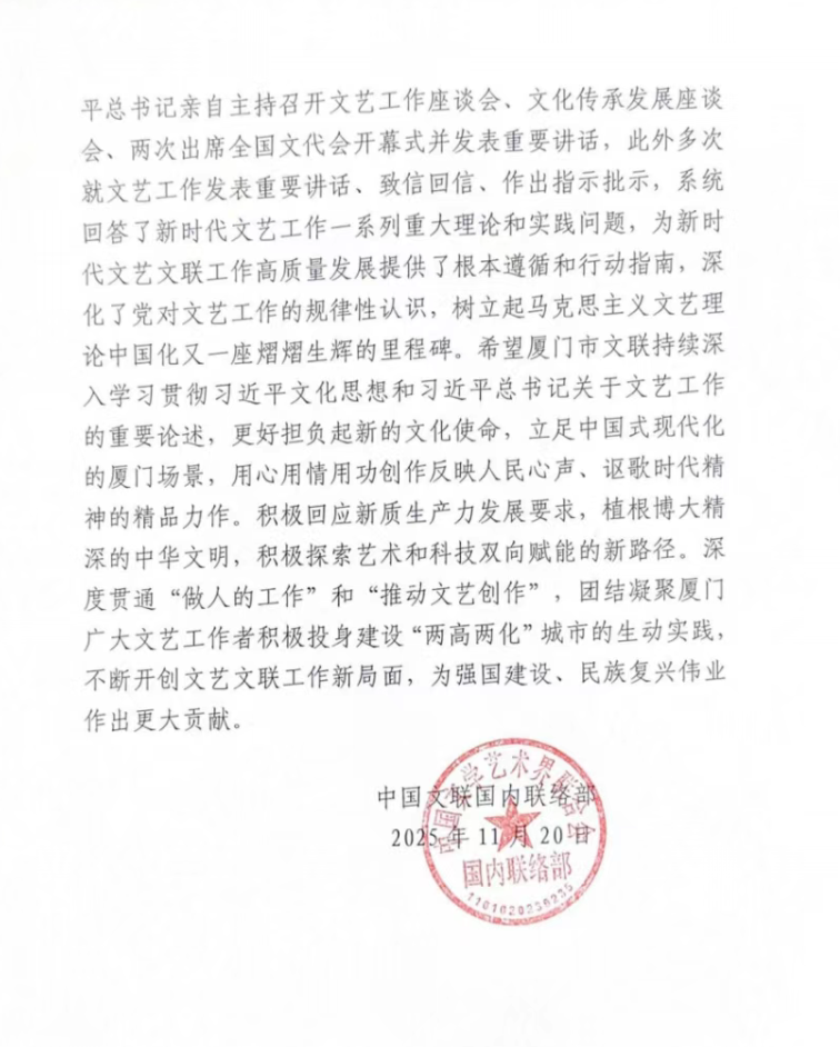 2025年12月6日,厦门市文联第十一次代表大会胜利召开。中国作协、中国文联国内联络部、中国各文艺家协会、各副省级城市文联、香港特别行政区政府驻福建联络处、菲律宾共和国驻厦门总领事馆、泰王国驻厦门总领事馆、新加坡驻厦门总领事馆、新西兰太平洋文化艺术交流中心等32家单位向厦门市文联发来贺信、贺函。