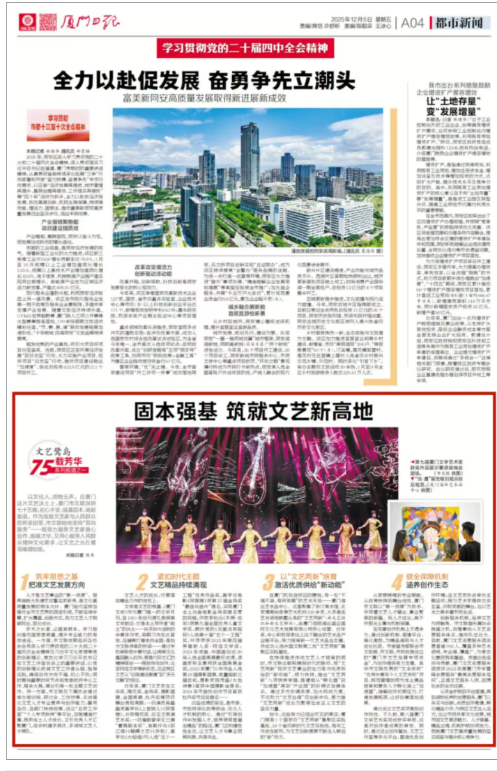 从资金护航到平台搭建,再到润物无声的志愿服务,厦门以务实与创新,点燃创作激情、孵化精品力作,为特区文艺注入活力,也让市民共享文化成果,城市因文艺更添魅力。人才强基、精品立魂、机制护航协同发力,筑就厦门文艺高质量发展的坚实底座与提升核心竞争力。