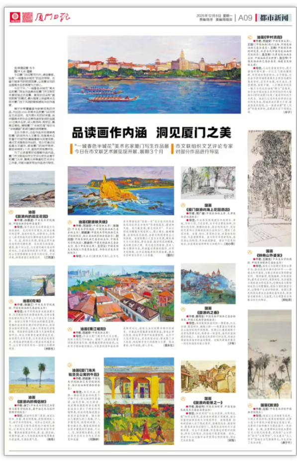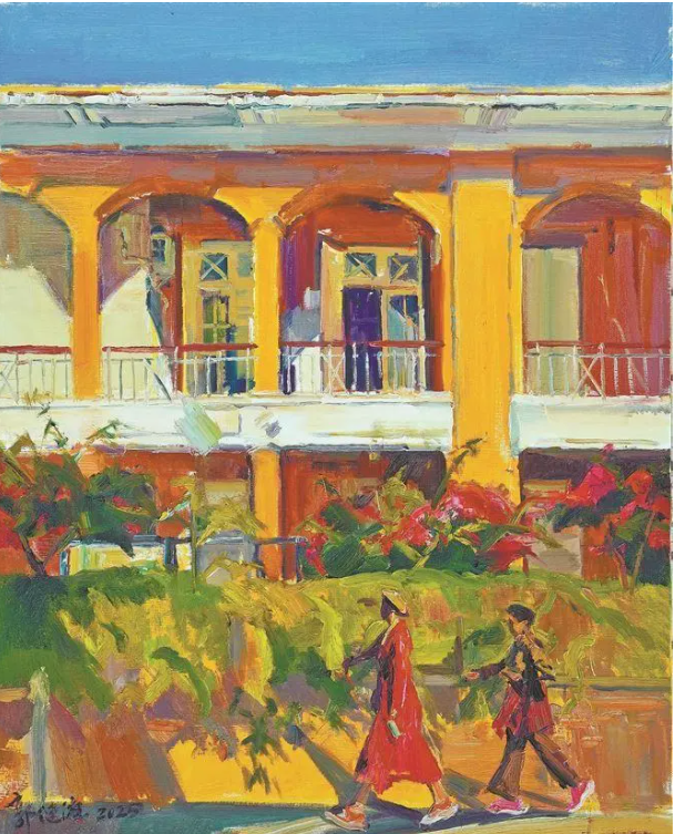 初见作品,仿佛一脚踏进鼓浪屿的某个宁静午后:阳光倾洒明黄墙面,海风穿廊,时光缓滞。画家精准捕捉闽南老建筑在海滨日照之下特有的明媚鲜亮,轻松的笔触流露出画家洋溢的激情。墙头探出几簇艳红的三角梅,行人步履悠闲,斑驳的树影、人影交融自然,整体画面既突出历史建筑的庄重感,又以人、花、树消解沧桑感,呈现出历史空间与当代生活的柔和连接。