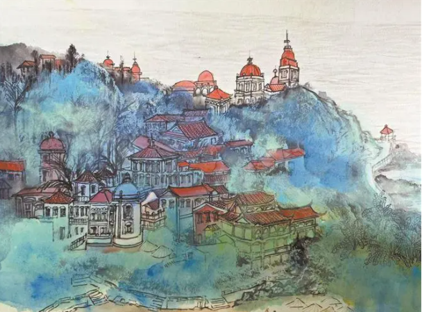 画家截取鼓浪屿的一隅景致,红瓦白墙、错落树木、蜿蜒小路……笔墨留白间营造出山海相依的开阔意境。色调以红建筑铺陈于淡青浅绿草木间,再晕染一抹蓝色,海风的湿润感跃然纸上。画家通过色彩的巧妙运用,传递出闽南海岛独有的温润雅致。这幅风景画更像是一封写给海岛的春日情书。
