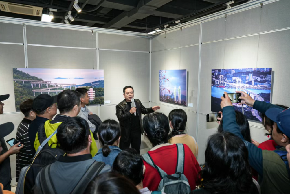 厦门市摄影家协会主席杨景初在展览现场导览。