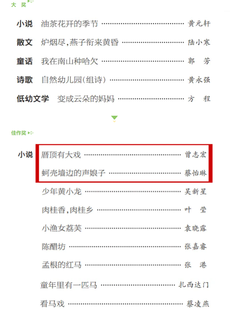 近期,厦门作家曾志宏作品《厝顶有大戏》、蔡怡琳作品《蚵壳墙边的声娘子》荣获2025年冰心儿童文学小说新作奖。本届冰心儿童文学新作奖共接到一千五百余位作者投稿。经几轮审慎评选,最终确定36篇获奖作品。其中大奖5篇,佳作奖31篇。