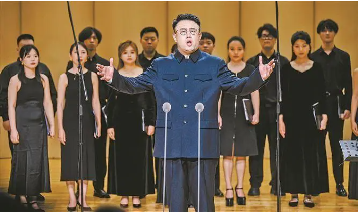 从“烽火诗篇”中战火年代的艺术呐喊,到“万众一心”的民族合唱;从“烽烟同歌”反法西斯同盟的国际回响,到“山河无恙”的当代传承,音乐会由四个篇章展开,让抗战精神在历史的回望与当代的传承中延续。卢骥凭借扎实的男中音功底与丰富的舞台掌控力,在不同风格作品中精准把控情绪张力,既能深沉内省,也能慷慨激昂。音乐会演出形式多元,合唱团与青年歌唱家、器乐演奏家的协同参与,丰富了舞台声响层次,柳琴、手风琴等乐器的加入,使音乐会在听觉层面有多维度的呈现。