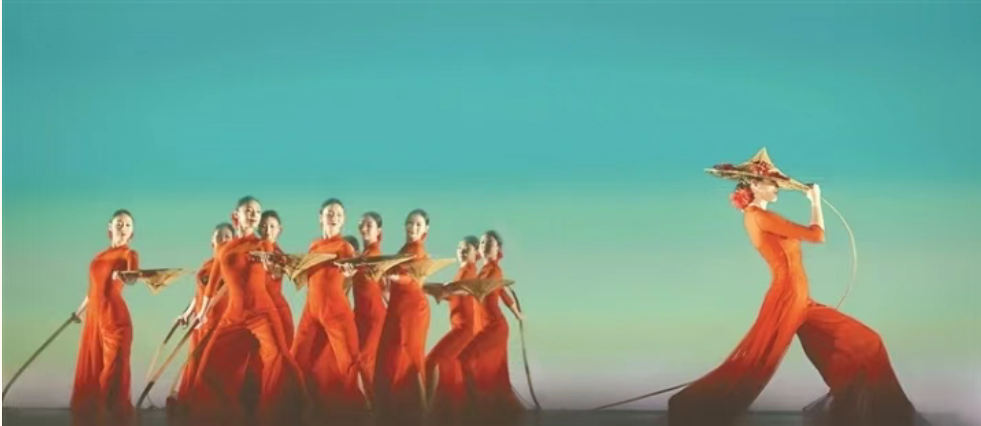 字幕提点出“猪笼仔”三字,字后的括号中加注着“偷渡者阿芸”。海庚此时向上场门一侧踱步而去。从此前作为“会议空间”的扁长形平台由横展旋转纵列来看,这是海庚追忆起初到南洋的屈辱岁月。这个扁长形平台是狮城的一处码头,码头上有苦力也有监工,凡下船者则要被搜身检查。“偷渡的阿芸”被扣下,而其他在场者是对阿芸的遭遇表现得非常冷漠的旅人。通过海庚的“闪念”插入这样一段“屈辱”,当然一方面是刻画他对“民族自强”的铭心刻骨,一方面也是适时推出成就非凡事业中不可或缺的平凡人物。“海的一半”中操办兴学者是海庚的胞弟海贤,而这位“偷渡的阿芸”则是海贤生命中的“一半”——他的恋人和操办兴学的助手。字幕的提点是:“海的另一半,弟弟来信了。”海贤推着一只扩放的纸船从上场门一侧迤逦而至,下场门一侧是仍在跪着的阿芸。随纸船而至的海贤欣然起舞,待到海庚起身将手杖放到椅旁,我们才感到海贤的独舞是海庚读信内容的联想:海庚融入海贤的舞蹈中并形成一段沉浸在儿时辰光的双人群,在手足之情同甘共苦中走向了兴学伟业的同舟共济……笔者很认同主创这种“说舞就舞”的设计。当然这并非舞剧表意“自由时空”的泛用,而是凸显出海庚先生在舞剧叙事中的“主诉视角”。他的“在场”和他的“心象”交织,形成了舞剧《海的一半》的独特叙事风格。弟弟来信引出的“心象”只是寒暄中的叙旧,迫在眉睫的现实是校费告急——这同时在舞台两侧字幕显现,意味着鹭门的海贤和狮城的海庚共同面临的困境。从开场的“开会”到接续的“来信”,可以看到舞剧的戏剧情势推进极快,我们似乎要借助“来信”之桥去联通乡情了。主创正是这样想的,切光后字幕的提点是“故乡:霞光与潮汐”。确切地说,主创让我们看到的是一段披着霞光、踏着潮汐的女子群舞,头戴竹笠、手持竹翠的女舞者身着暖色调的衣装,依稀展现出一种妩媚其外、坚韧其内的闽南渔女风情,当然这也是所谓“闽派风格”的内质。又是字幕的提点:“鹭门第一所学校。”笔者虽然起初对这种字幕提点的方式并不习惯,但屡次三番,却也觉得它可以成为一种舞剧叙事的形式感建构,只是我们对“提点”的内容还可以加以推敲、加以凝练。比如“大海茫茫”那段,就可提点为“闯海”,“一个会议”那段不妨就叫“开会”,“弟弟来信”简称“来信”即可。而当下的“鹭门第一所学校”,从内容的展开来看可提点为“返乡”,而此前的“故乡”一段完全不必另置,并入此段即可。笔者称为“返乡”的这段由学生的“迎宾舞”开启,其中类似“划桨”的动态寓意迎接海外宾朋。在一段板鼓引导的地方乐曲中,海庚一行来到家乡为“鹭门学村”揭牌:舞板凳的、舞旗的、舞狮头的,接踵登场;最后汇聚成龙舟竞渡的阵势,海庚、海贤则分别持握龙珠和龙首,将“返乡”,确切说是“兴学”的仪式推向高潮……忽然觉得,这段“返乡”也是海庚在阅读“弟弟来信”时的追忆!
