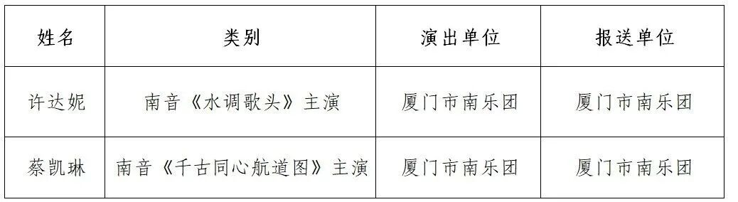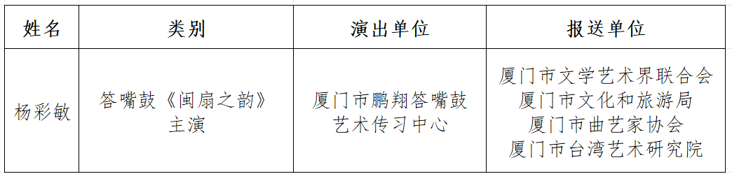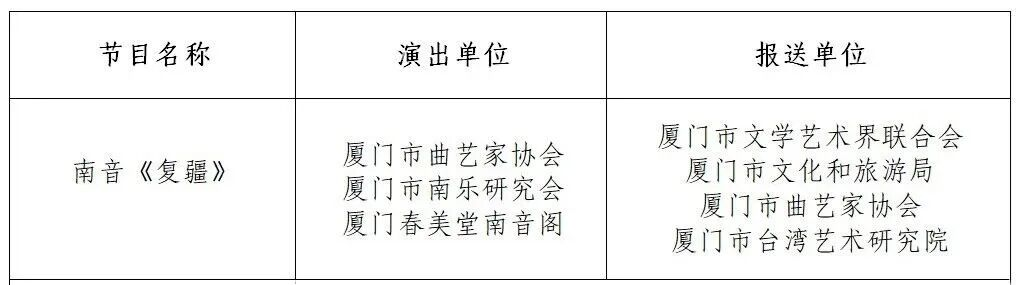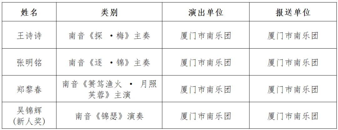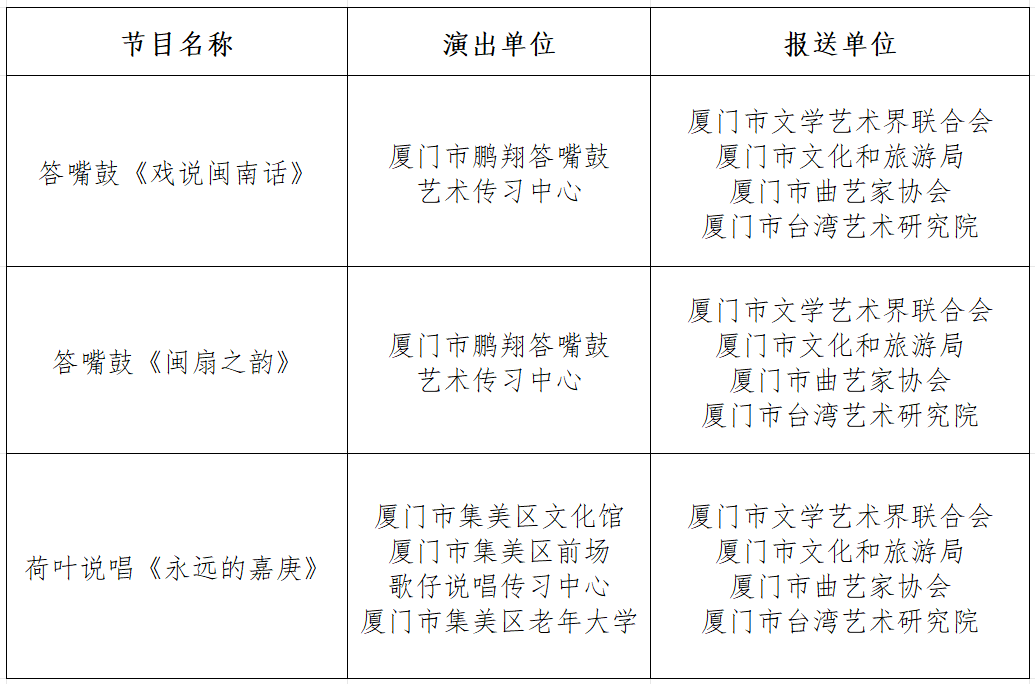 由福建省文学艺术界联合会、福建省文化和旅游厅主办,福建省曲艺家协会承办的第六届福建省曲艺丹桂奖比赛,经赛组委会组织评审专家按照程序评审,产生第六届福建省曲艺丹桂奖获奖名单。我市共18个作品获奖,市文联、市文旅局、市曲艺家协会、厦门市南乐团获优秀组织奖,具体获奖名单如下: