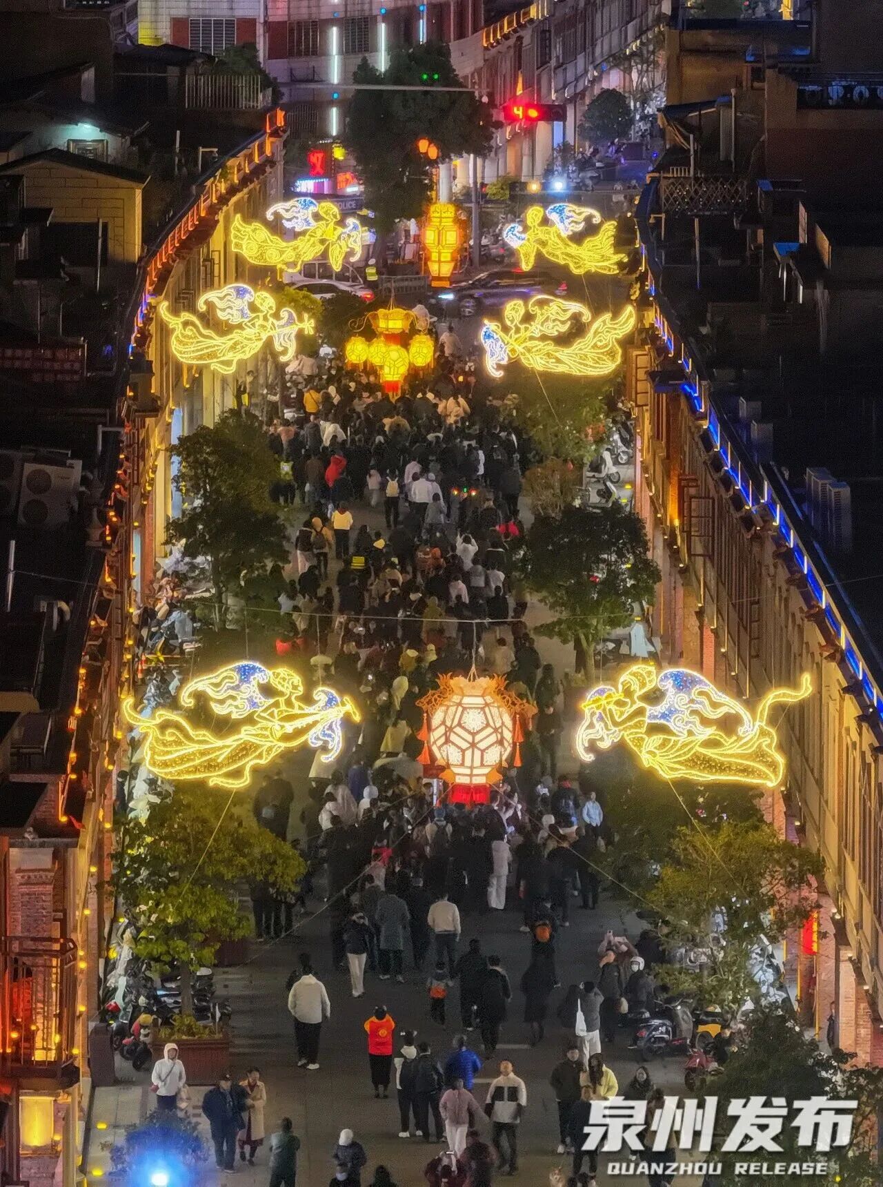 泉州中山中路妙音飞天灯亮起。图源:“泉州发布”微信公众号