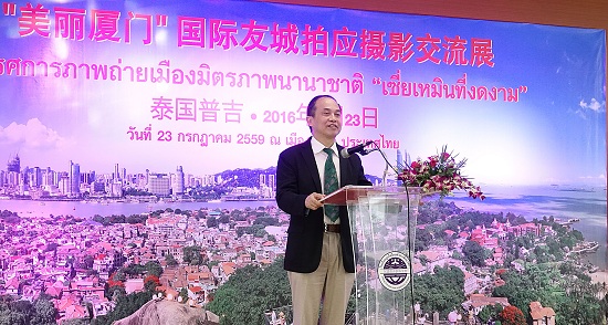 为宣传推介“美丽厦门”,深化对外文化交流交往,在市委宣传部的大力支持下,市外侨办和市文联近日联合在泰国普吉府举办“美丽厦门.国际友城摄影交流展”。普吉府副府尹布拉贾·阿宋谭玛坤(Prachiad Aksornthamakul)先生,厦门市文联党组书记、常务副主席林起率领的厦门文艺交流访问团一行,普吉文化局、普吉旅游局、东盟普吉泰华学校、普吉福建会馆等当地相关单位和社团代表约150余人出席开幕式,并参观展览。