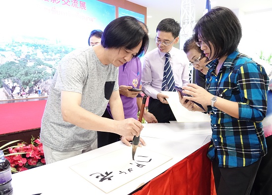 在开幕式上,厦门市文联党组书记、常务副主席林起介绍了美丽厦门建设和鼓浪屿申遗工作。普吉府副府尹布拉贾·阿宋谭玛坤先生在致中回顾了两地旅游、文化交往情况,表达了深化交流,共同发展的愿景。厦门市张晓寒美术研究会、山水画研究会会长,当代“闽派”著名画家林良丰先生现场进行书画展示,为与会嘉宾提写书法作品,受到嘉宾和观众的欢迎。厦门代表团成员现场合唱《鼓浪屿之波》,场面动人、热烈。(文、图/小杜)